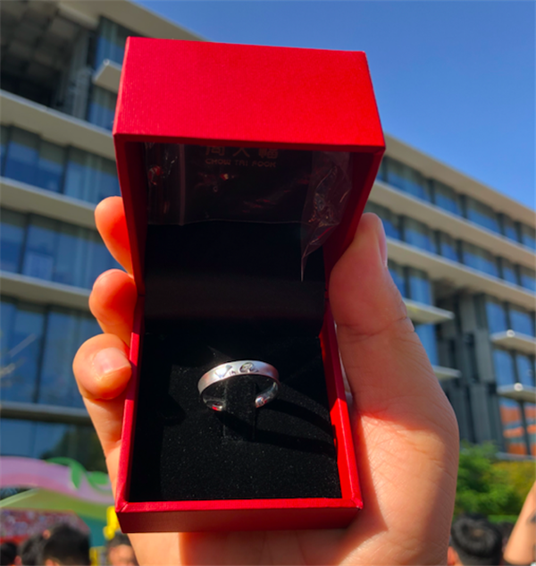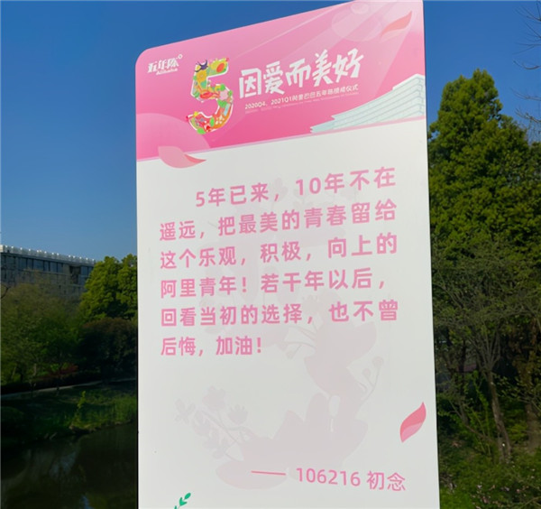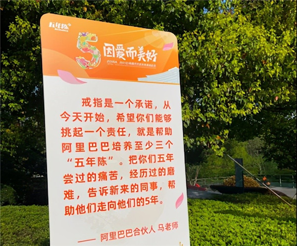 在阿里巴巴園區,阿里巴巴合伙人馬老師的一段祝福被放在顯眼位置,“戒指是一個(gè)承諾,從今天開(kāi)始,希望你們能夠挑起一個(gè)責任,就是幫助阿里巴巴培養至少三個(gè)五年陳。把你們五年嘗過(guò)的痛苦,經(jīng)歷過(guò)的磨難,告訴新來(lái)的同事,幫助他們走向他們的5年。”