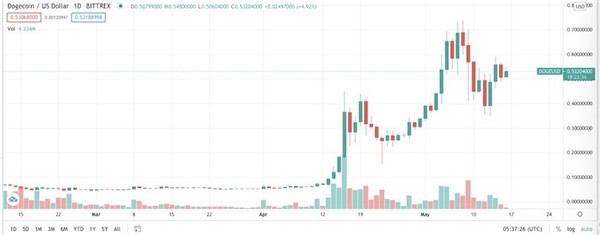 5月16日,狗狗幣短線(xiàn)走高,重回0.54美元/枚上方。特斯拉創(chuàng )始人馬斯克(Elon Musk)在其社交平臺發(fā)表動(dòng)態(tài)稱(chēng),在理想汽車(chē)情況下,狗狗幣可將區塊時(shí)間加快10倍,將區塊大小增加10倍,并將費用降低100倍,從而可以輕而易舉的獲勝。