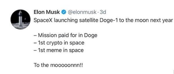 嘗到甜頭的馬斯克,又將目光投向名不見(jiàn)經(jīng)傳的狗狗幣身上。狗狗幣一年多上漲200倍后,馬斯克宣布將用狗狗幣融資的錢(qián),在明年發(fā)射月球衛星。