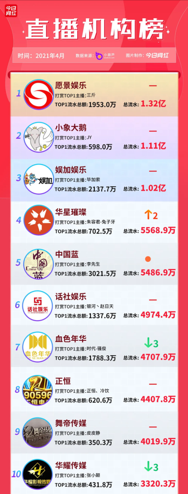 我們看到直播行業(yè)主播“滾雪球”式膨脹。4月份,據小葫蘆數據統計的網(wǎng)紅榜單顯示,全網(wǎng)3家網(wǎng)紅機構,單月打賞,流水過(guò)億。排名前15的網(wǎng)紅機構,月打賞總流水8.16億。
