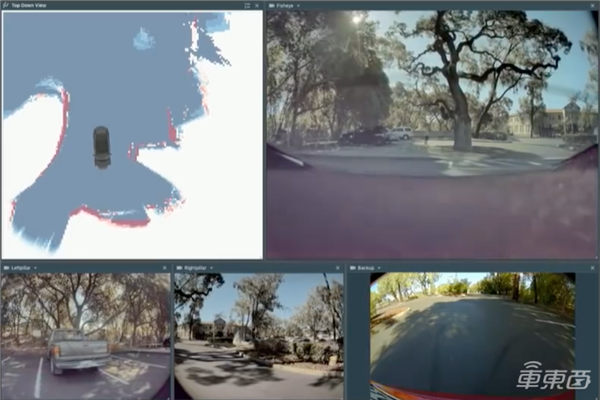 在計算出三維圖景之后,特斯拉甚至可以計算出車(chē)輛的“鳥(niǎo)瞰視圖”。也就是說(shuō),雖然車(chē)輛上方?jīng)]有攝像頭,但通過(guò)計算就能模擬出從車(chē)輛上方向下看的圖景。這樣一來(lái),車(chē)輛離障礙物還有多遠的距離,車(chē)內都能直觀(guān)地看到。