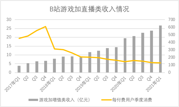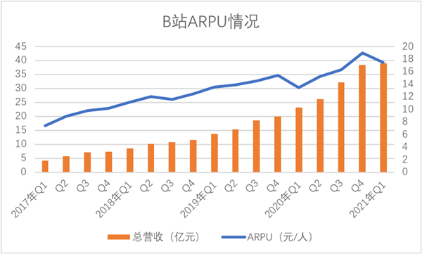 在過(guò)去的四年多時(shí)間里,B站ARPU以及總營(yíng)收均得到不同程度的提高,但我們也發(fā)現, 2021年Q1總營(yíng)收是2017年同期10倍,與此同時(shí),ARPU僅是兩倍有余。