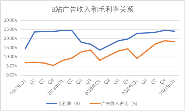 其原理是比較容易理解的,相較于直播業(yè)務(wù)下平臺需要與主播分傭,游戲業(yè)務(wù)的目標用戶(hù)群又相對較窄,且研發(fā)以及競爭壓力也相對較大,廣告這一互聯(lián)網(wǎng)業(yè)最古老的商業(yè)模式的價(jià)值開(kāi)始在B站顯現,借廣告這一高成長(cháng)及低成本模式,B站得以改善毛利率。