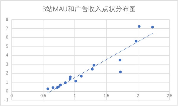 在此之前,我們往往用ARPU值來(lái)反映平臺的廣告變現能力,但在上圖中,我們將B站的MAU和廣告收入做點(diǎn)狀分布,并擬合趨勢折線(xiàn),用以做動(dòng)態(tài)趨勢性判斷,較之ARPU要更加精準一些(這也符合數據分析的基本原理)。