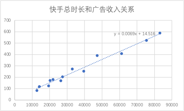 我們不妨用快手做對比,短視頻與B站共通性要更大一些,在快手的廣告收入模型中,我們測算了季度用戶(hù)使用總時(shí)長(cháng)與廣告收入的關(guān)系,見(jiàn)下圖