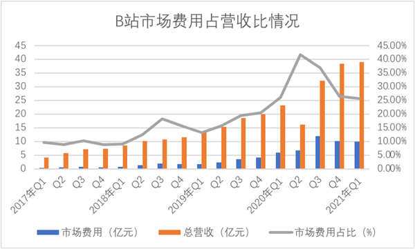 B站與2018年Q1赴美上市,當年通過(guò)發(fā)行普通股共募集現金接近50億元,在資本市場(chǎng)充實(shí)現金之后,當季市場(chǎng)費用占應收比就開(kāi)始增長(cháng),但在2019年之后(準確說(shuō)是下半年開(kāi)始),市場(chǎng)費用占應收比才陡然增加,也就是說(shuō),在上市之初,雖然募集到了資金,但企業(yè)在市場(chǎng)費用的花費中仍不激進(jìn),直到2019年下半年開(kāi)始。