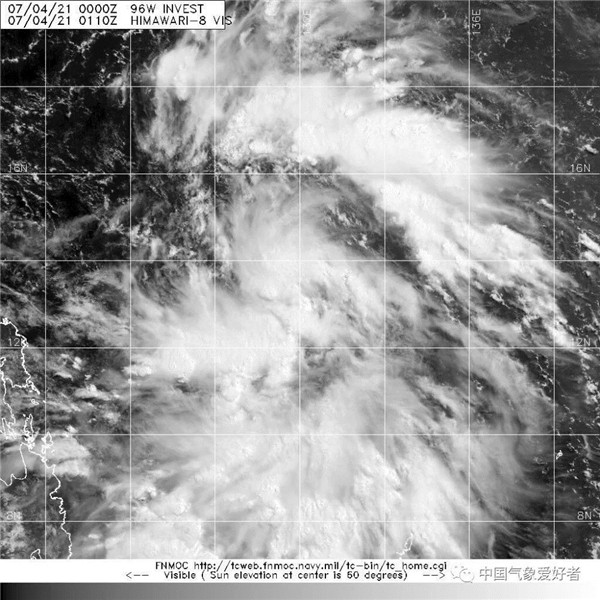 7月4日下午臺風(fēng)胚胎96W云圖可見(jiàn),系統的螺旋性已經(jīng)比較強。來(lái)自FNMOC