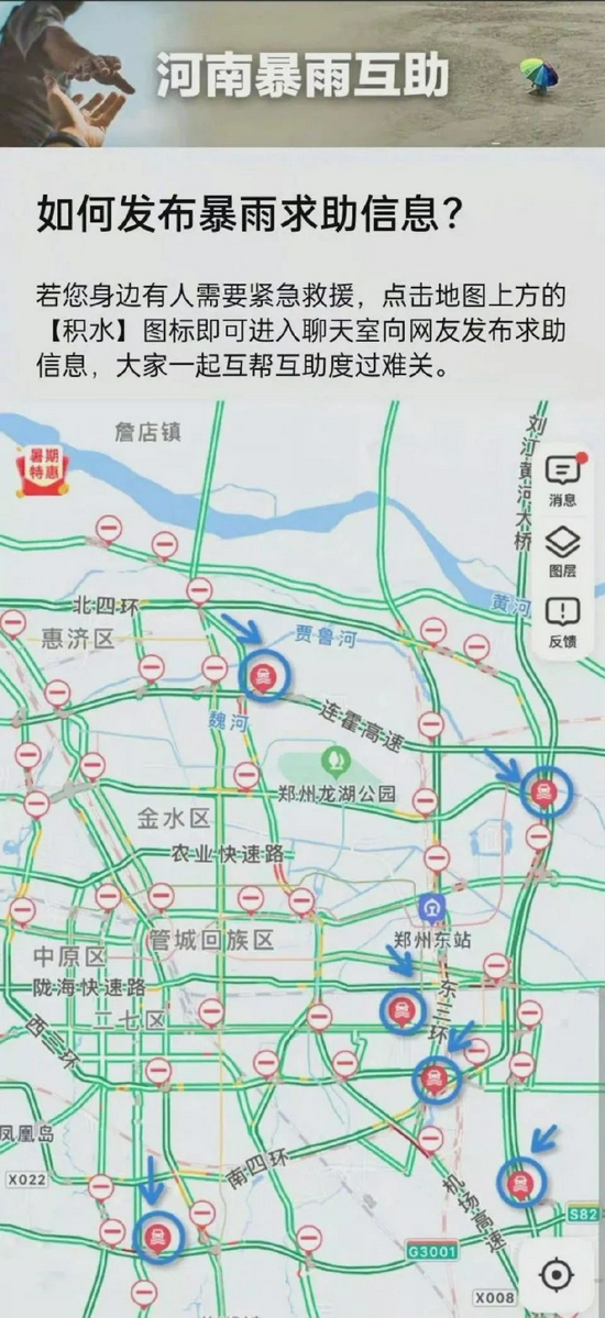 7月21日凌晨1時(shí)30分,高德地圖緊急上線(xiàn)河南暴雨信息互助通道功能。出現積水或者封路等道路交通事件時(shí),互助通道便會(huì )自動(dòng)開(kāi)啟。