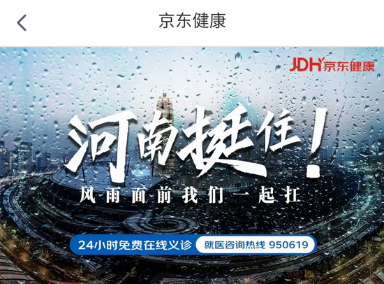在京東平臺上搜索“河南暴雨”,可以自動(dòng)跳轉到京東健康24小時(shí)免費在線(xiàn)義診頁(yè)面,上面不僅可以與各科醫生直接聯(lián)系,還有京東公益“物愛(ài)相連”平臺通道、消殺防疫物資購買(mǎi)通道以及暴雨避險自救攻略。
