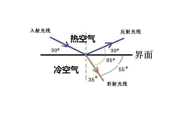 還有一種情況,光在同一種介質(zhì)中傳播,當介質(zhì)密度不均勻時(shí),也會(huì )出現折射現象,其實(shí),這就是相當于兩種密度不同的介質(zhì),光始終會(huì )向密度大的方向偏轉。