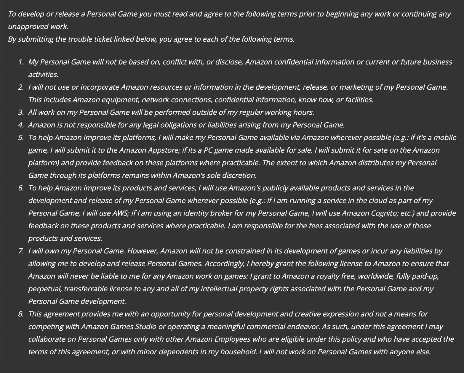 第 7 條政策聲明:“我將免費、全球、完全付費、永久、可轉讓地授權給亞馬遜以獲得與我的個(gè)人游戲和我的個(gè)人游戲開(kāi)發(fā)相關(guān)的任何知識產(chǎn)權。”換言之,負責獨立游戲項目的員工必須將自己的 IP 免費轉讓給亞馬遜。