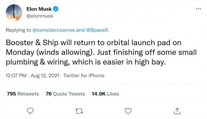 當地時(shí)間 8 月 12 日,SpaceX 將 Starship 20 從發(fā)射臺移走,但 Super Heavy Booster 4 仍在那里呆了幾天時(shí)間。據推測,由于強風(fēng),助推器仍在發(fā)射臺上。最近,SpaceX CEO 埃隆·馬斯克回復了一條推問(wèn),該推問(wèn)顯示了本周早些時(shí)候 Super Heavy Booster 4 被帶回生產(chǎn)現場(chǎng)的視頻。馬斯克在推文上指出,助推器和星際飛船將在周一返回軌道發(fā)射臺,這取決于風(fēng)向。