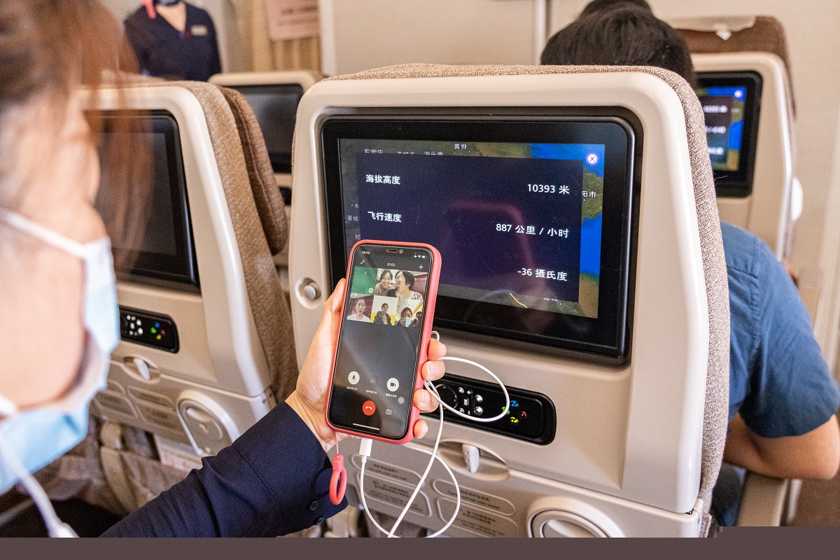 旅客在萬(wàn)米高空利用 MU5101 航班高速網(wǎng)絡(luò )與朋友們視頻通話(huà)
