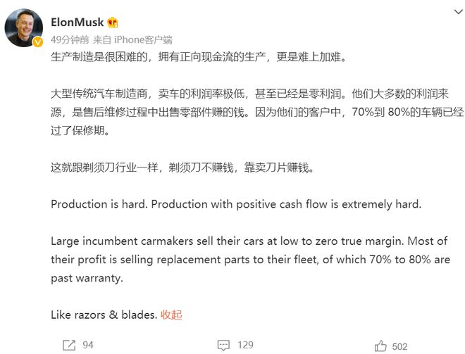 馬斯克還將傳統汽車(chē)與剃須刀行業(yè)類(lèi)比,并稱(chēng)“這就跟剃須刀行業(yè)一樣,剃須刀不賺錢(qián),靠賣(mài)刀片賺錢(qián)”。
