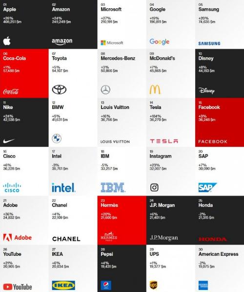 亞馬遜和微軟分別以 2490 億美元和 2100 億美元的估值位居第二和第三位,而 Google 和三星則躋身前五名。從這個(gè)角度來(lái)看,蘋(píng)果、亞馬遜和微軟的集體估值占前十名品牌總價(jià)值的 62.3%。