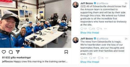 幾小時(shí)后,貝索斯在個(gè)人社交媒體 Twitter 上寫(xiě)道:“來(lái)自愛(ài)德華茲維爾的消息讓人悲痛的。我們對這次事故中失去的同伴感到心碎,我們的思念和祈禱與他們的親人同在。”