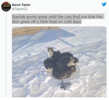 “星鏈效果很好,直到貓發(fā)現天線(xiàn)在寒冷的日子里會(huì )散發(fā)出一點(diǎn)熱量,”這位名叫阿隆·泰勒的網(wǎng)友說(shuō)道。