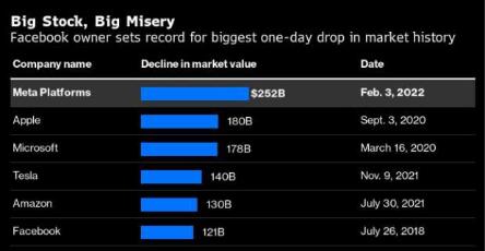 Facebook母公司Meta發(fā)布業(yè)績(jì)不及分析師預期的財報后導致該股暴跌26.39%,市值在一天之內蒸發(fā)了2520億美元。這是有史以來(lái)美國公司市值單日損失最大的一次。