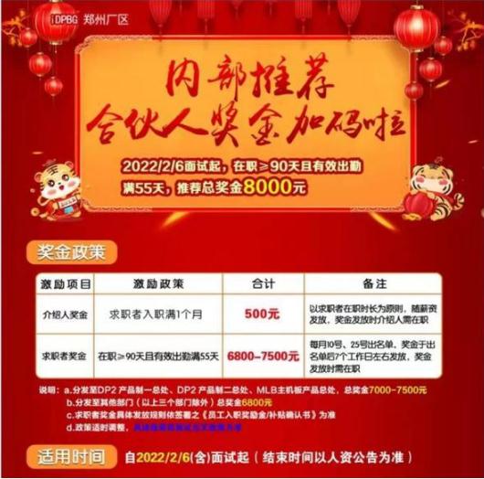 據鄭州富士康iDPBG事業(yè)群公告,該廠(chǎng)區自2月4日起展開(kāi)招工,內部推薦獎金為6000元。富士康稱(chēng),開(kāi)工就是旺季,“訂單滿(mǎn)滿(mǎn),福利多多,錢(qián)包鼓鼓。”