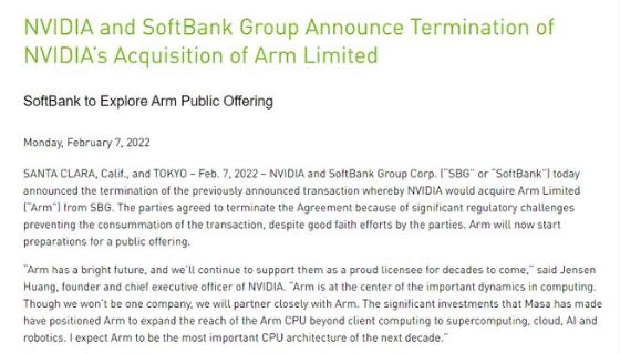 2 月 8 日消息,當地時(shí)間周一,美國芯片巨頭英偉達和日本軟銀集團正式宣布,終止此前有關(guān)英國芯片設計公司 Arm 的收購交易。盡管雙方做出了巨大努力,但由于重大監管挑戰阻礙了交易的完成,雙方同意終止協(xié)議。Arm 現在將開(kāi)始為首次公開(kāi)募股(IPO)做準備。