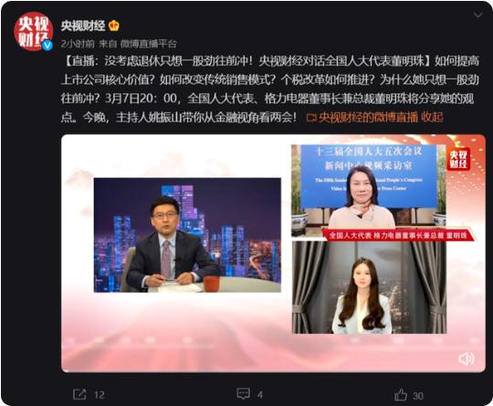 全國人大代表、格力電器董事長(cháng)兼總裁董明珠接受了央視財經(jīng)的采訪(fǎng)。對于是否考慮退休生活,董明珠回應稱(chēng):“沒(méi)考慮,因為現在不是考慮這個(gè)事的時(shí)候,我一考慮就懈怠了。”