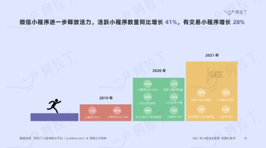 2022 年是微信小程序上線(xiàn)以來(lái)的第五年。在今年的微信公開(kāi)課 Pro 公開(kāi)數據得知,微信小程序數量 300 萬(wàn)+(占全網(wǎng)小程序數量 43%),DAU(日均活躍用戶(hù)數量)4.5 億,同比增長(cháng) 32%?;钴S小程序穩步增長(cháng) 41%,有交易的小程序數持續增長(cháng) 28%。