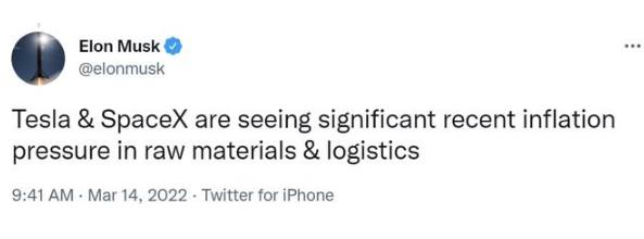 今日上午,特斯拉CEO、SpaceX CEO埃隆?馬斯克(Elon Musk)通過(guò)社交媒體表示,特斯拉和 SpaceX 最近在原材料和物流領(lǐng)域面臨著(zhù)巨大的通脹壓力。