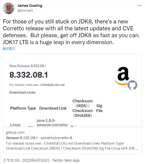 不過(guò)醉翁之意不在酒,原來(lái) Java 之父只是為了給東家 AWS 的 OpenJDK 發(fā)行版 Corretto “帶貨”,他建議仍在使用 JDK 8 的開(kāi)發(fā)者可以考慮使用 Corretto 的新版本——包含了所有最新的更新和 CVE 防御。
