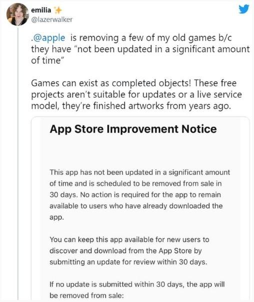 “您可以通過(guò)在 30 天內提交更新以供審核,讓新用戶(hù)可以從 App Store 發(fā)現和下載此 App,”蘋(píng)果在電子郵件中寫(xiě)道。“如果在 30 天內沒(méi)有提交更新,該 App 將被下架。”