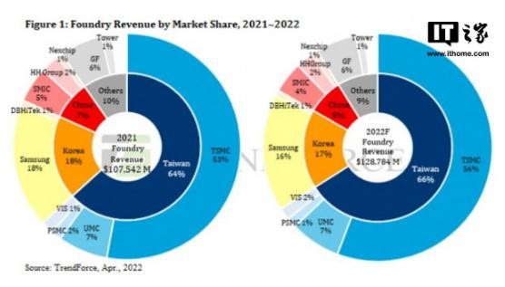 TrendForce 稱(chēng),“今年,包括臺積電、聯(lián)電和 PSMC 在內的中國臺灣代工企業(yè)的市場(chǎng)份額預計將從 64% 增加到 66%,而包括三星電子和 DB HiTek 在內的韓國公司的市場(chǎng)份額可能會(huì )從 18% 下降到 17%。”
