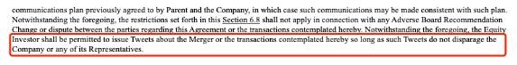 文件顯示,馬斯克仍被允許在推特上討論交易,但語(yǔ)氣必須友善。“股權投資者應被允許發(fā)布有關(guān)本協(xié)議擬議的合并或交易的推文,只要此類(lèi)推文不詆毀公司或其任何代表。”文件顯示。目前還不清楚如果馬斯克違反協(xié)議會(huì )遭到何種處罰。