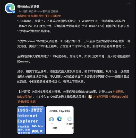 微軟 Edge 瀏覽器官微發(fā)文提醒微軟 IE 瀏覽器將于 6 月 16 日正式退役,并稱(chēng)被黑了這么多年,IE 要正式跟大家說(shuō)再見(jiàn)啦。從今以后,這條路由 Edge 替 IE 繼續走下去。