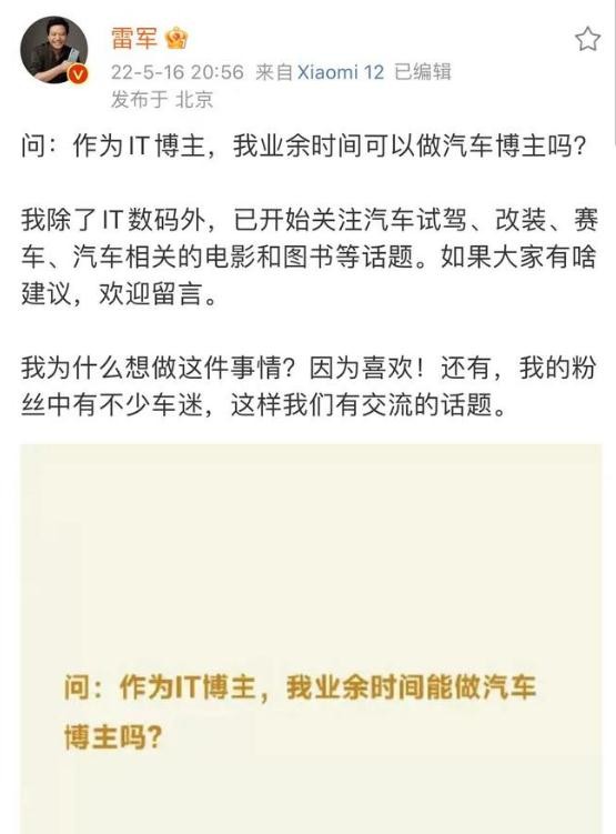 雷軍表示,自己做這件事是因為喜歡!還有粉絲中有不少車(chē)迷,這樣有交流的話(huà)題。