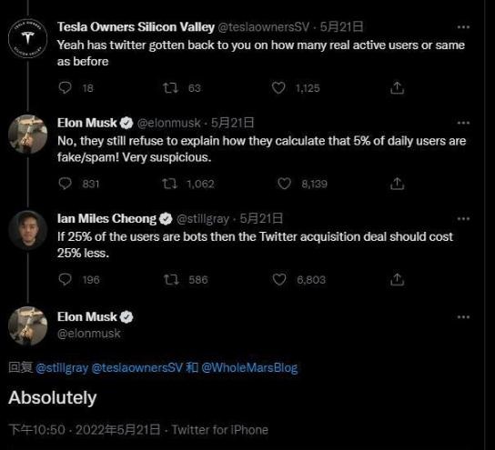 美國當地時(shí)間周六,推特用戶(hù) Ian Miles Cheong 發(fā)推文,談及馬斯克可能降低收購推特出價(jià)的想法,他寫(xiě)道:“如果 25% 的推特用戶(hù)是機器人,那么收購推特的交易成本也應該降低 25%。”馬斯克對此給出肯定回復。