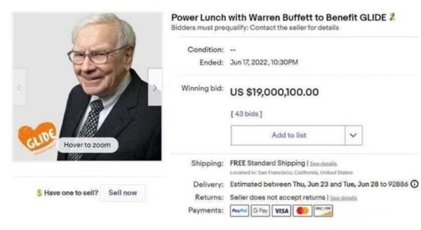 在受疫情影響被迫中斷兩年后,2022 年的巴菲特午餐于當地時(shí)間 6 月 12 日 19 時(shí) 30 分(北京時(shí)間 13 日 7 時(shí) 30 分)在 eBay 開(kāi)拍,持續到 6 月 17 日結束,起拍價(jià)為 2.5 萬(wàn)美元(約 16.85 萬(wàn)元人民幣)。