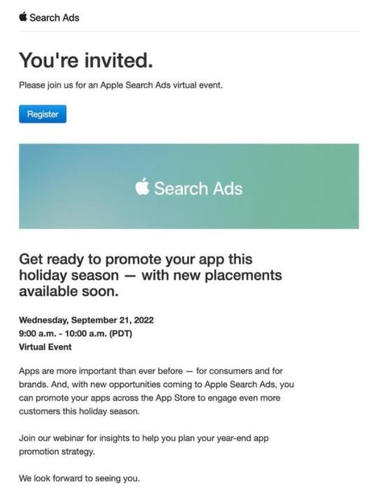 對于消費者和品牌而言,應用程序比以往任何時(shí)候都更加重要。而且,隨著(zhù)蘋(píng)果搜索廣告的新機遇的到來(lái),你可以在 App Store 中推廣你的應用,在這個(gè)節日季吸引更多的用戶(hù)。加入我們的網(wǎng)絡(luò )研討會(huì ),幫助你規劃年終應用推廣策略。我們期待見(jiàn)到您。