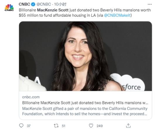亞馬遜創(chuàng )始人杰夫?貝索斯(Jeff Bezos)前妻麥肯齊?斯科特(Mackenzie Scott)剛剛捐贈了位于加州洛杉磯富人區的兩棟豪宅。這兩棟住宅總價(jià)值約為 5500 萬(wàn)美元,它們將被出售以幫助當地建設保障性住房籌集資金。