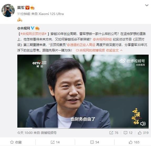 繼俞敏洪后,央視網(wǎng)財經(jīng)紀實(shí)訪(fǎng)談節目《云頂對話(huà)》迎來(lái)第二期,此次的主角是小米董事長(cháng)雷軍。