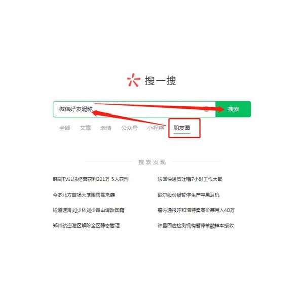 2.進(jìn)入到搜一搜頁(yè)面后,搜索輸入框下方標簽點(diǎn)擊朋友圈,然后再輸入框內輸入微信好友的昵稱(chēng)或想搜的朋友圈內容 然后點(diǎn)擊搜索。
