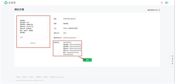5.點(diǎn)詳情進(jìn)入后我們就可以看到模板的實(shí)例和詳細內容,點(diǎn)擊添加就會(huì )到模板消息列表里。
