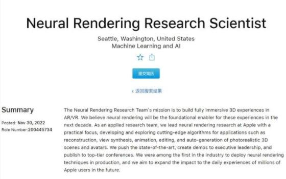 據蘋(píng)果官網(wǎng)顯示,其位于西雅圖的神經(jīng)渲染研究團隊正在招募一位神經(jīng)渲染研究科學(xué)家。