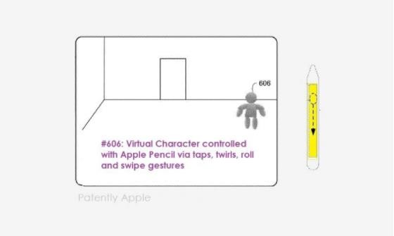 該專(zhuān)利的主要內容如下:在下面的圖 1 和圖 6B 上,我們看到一個(gè)用戶(hù)拿著(zhù) Apple Pencil,在這種情況下,它被用作游戲控制器來(lái)移動(dòng)對象或游戲角色,蘋(píng)果稱(chēng)之為“虛擬代理”(Virtual Agent)#606。Apple Pencil 的功能將包括涉及在 Pencil 的觸摸表面上敲擊、滾動(dòng)、旋轉、輕彈和滑動(dòng)的輸入。