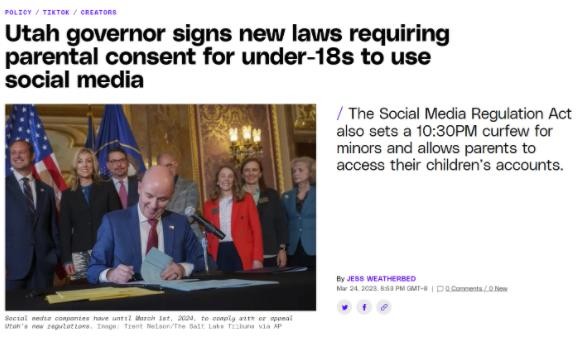 據外媒 The Verge 報道,美國猶他州頒布了有爭議的限制措施,要求 18 歲以下未成年人獲得監護人的同意才能使用社交媒體平臺,這是美國第一個(gè)出臺此類(lèi)措施的州。