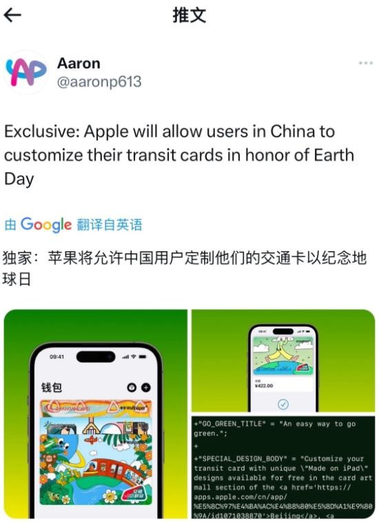 據 Aaron 消息,蘋(píng)果 Apple Pay 將在中國地區上線(xiàn)交通卡卡面圖案自定義活動(dòng),以此來(lái)紀念地球日。