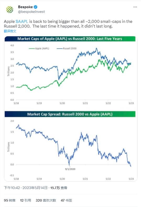 根據彭博社報道,蘋(píng)果公司的市值已超過(guò)羅素 2000 指數(Russell 2000)總和兩周時(shí)間,這是有記錄以來(lái)最長(cháng)的一次。