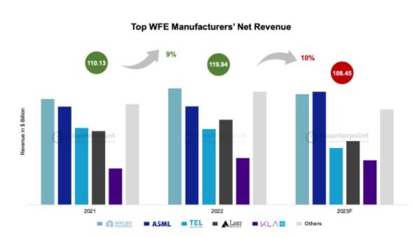 報告中指出 WFE 市場(chǎng)在連續 3 年增長(cháng)之后,預估 2023 年凈收入為 1084.5 億美元(當前約 7754.18 億元人民幣),同比下降 10%。