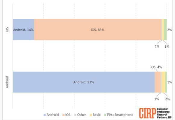 現在,CIRP 公布了新的數據,表示在過(guò)去一年里,美國有 14% 的新 iPhone 用戶(hù)之前用的是 Android。而 Android 用戶(hù),其中則只有 4% 的用戶(hù)過(guò)去是 iPhone 用戶(hù)。