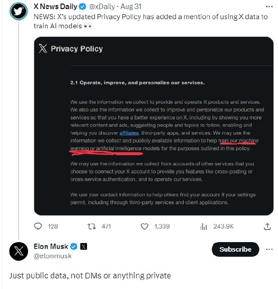 據報道,埃隆?馬斯克旗下社交平臺 X(推特)日前調整了隱私政策,允許 X 使用用戶(hù)發(fā)布的信息來(lái)訓練其人工智能(AI)模型。