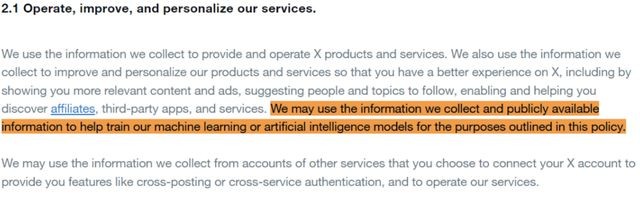這兩天X(Twitter)更新了隱私政策,也明確說(shuō)明了馬斯克要用 Twitter 數據訓練模型:我們可以使用我們收集的信息以及公開(kāi)可獲取的信息,來(lái)幫助訓練我們的機器學(xué)習或人工智能模型,以達到本政策中列明的目的。