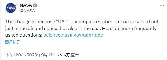 UAP 的全稱(chēng)叫做 Unidentified Anomalous Phenomena,而公眾更喜歡把這類(lèi)東西稱(chēng)為 UFO,即不明飛行物。至于為什么要起一個(gè)大家都不熟悉的名字,NASA 解釋稱(chēng),UFO 指的是空中觀(guān)察到的不明現象,而 UAP 的范圍還包括海洋。